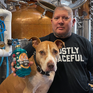 Mr. Pickles is a seven-year-old American Pitbull Terrier found wandering around the parking lot of a mall in Bakersfield, California. He was rescued from the pound by Wolf Spirit Master Distiller Ben Green and taken to Eugene, Oregon, home to the Wolf Spirit Distillery. With his broad chest, intense stare and spiked collar, Mr. Pickles may come across as a real tough guy, but once this tail-wagging machine starts loving on you, it’s hard to make the kisses and licks stop. Since his arrival, Mr. Pickles has become the emotional heart of Wolf Spirit, providing not only companionship, but listening intently to ideas for new spirits, inspecting all the grains and botanicals for our products and standing guard over our mash tuns, fermenters and column stills (when he isn’t snoozing in the sun).